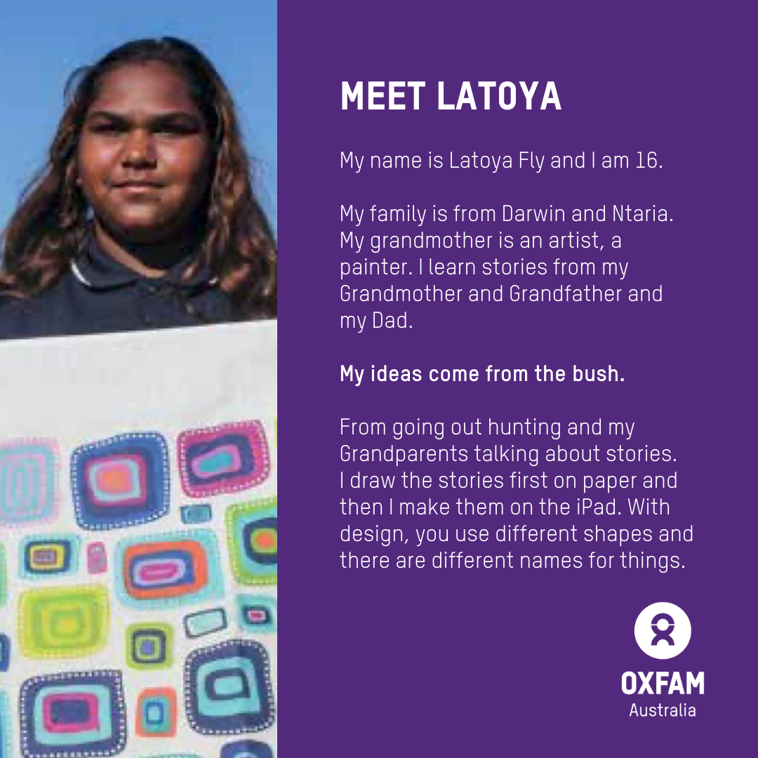 Oxfam has been working with Aboriginal & Torres Strait Islander communities for over 47 years and I’m proud to be able to support Latoya and Ntaria Design in taking Western Arrarnta design to the national stage and to work with such a powerful organisation. While there’s more work than ever to be done to challenge injustice, fix broken systems, and support Aboriginal and Torres Strait Islander Peoples’ right to self-determination, I hope to be able to share more of Latoya’s work with Oxfam Australia in the future.