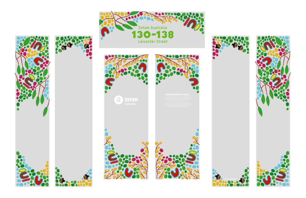 As part of their commitment to work with First Nations Peoples and communities, Oxfam Australia worked with Ntaria Design and Latoya Fly, a 16 year old Western Arrarnta artist from Ntaria/Hermannsburg to design a special commission for new artwork for their foyer in the head office, on Wurundjeri country. Latoya’s design work is now being represented and implemented across their social media channels and their First People’s Program materials.