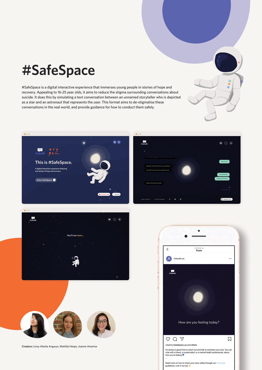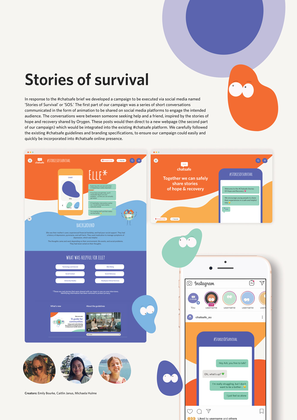 As part of RMIT Communication Design studio program in 2020, Un/Certain positions was designed to teach students about how to be ethical and careful designers, while creating safe learning spaces online that prioritised self-care. In partnership with the #chatsafe team at Orygen Youth Mental Health, and the design studio Portable, the studio focused on representing the lived experiences of real young people, their thoughts of suicide, and their experiences seeking help and their recovery journey. Students were tasked with creating an online and social media campaign for young people to share their experiences in a safe, helpful, and meaningful way.